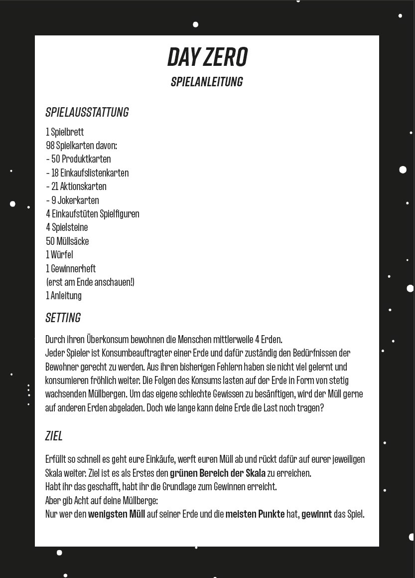 Day Zero - konsumiert euch glücklich ist ein Brettspiel, dass kritisch die westliche Konsumgesellschaft beleuchtet., in der wir weit über unsere Verhältnisse hinaus leben. Day Zero steht symbolisch für das Ablaufdatum unserer Erde. Ziel des Spiels ist es schnell die Einkäufe zu erledigen und den produzierten Müll auf anderen Planeten abzuladen.